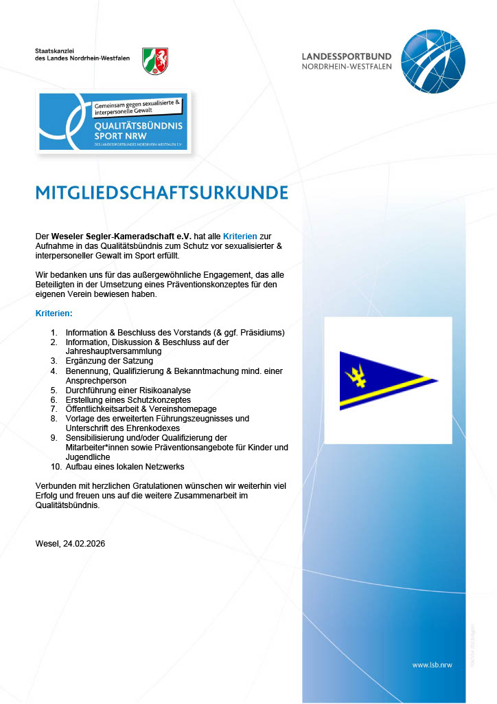 Die Weseler Segler-Kameradschaft wurde in das Qualitätsbündnis des LSB NRW aufgenommen.